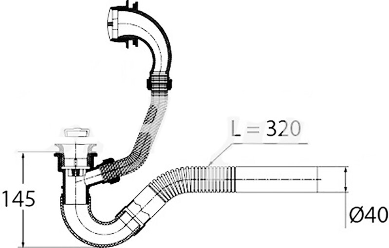Сифон неповоротный для ванной с переливом, с выпуском и пластиковой решеткой. Подключение к канализации с помощью гофры 40