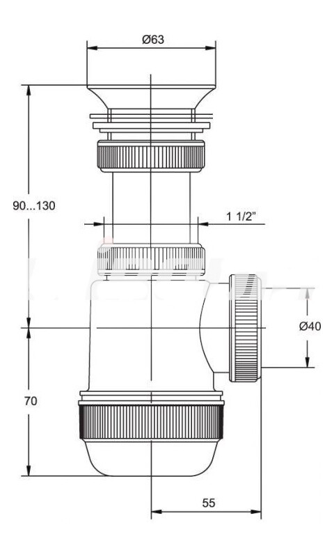 Сифон: Бутылочного типа Регулировка по высоте: от 90 до 130 мм Гидрозатвор: 50 мм Вход: 1½" Выход: Ø40/50 мм Решетка пластик: Ø63 мм Выпуск: есть Скорость слива: 52 л/мин