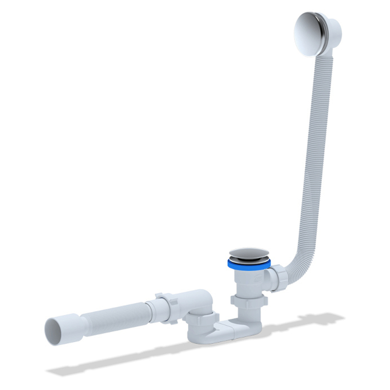 AQUANT. V650-30-MR Сифон для ванны плоский регулир. 1 1/2"х40 с выпуск, перелив., мет.реш, гибкой трубой 40х50