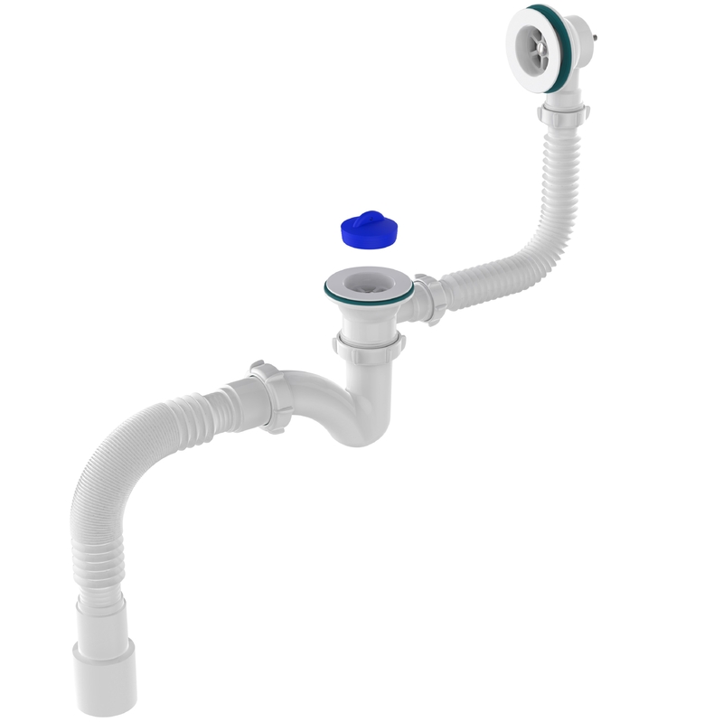ORIO. АН-28089-75 Cифон для ванны (обвязка) ОРИО 1 1/2"х40 плоский, регулируемый с переливом 75 см и гибкой трубой 40/50 (полуавтомат)
