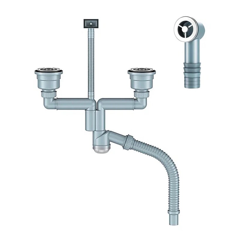 ORIO. Д-11008У-2 Сифон двойной для кухни с выпуском NORDFORM ОРИО 3 1/2, смещенный (телескопич.), с универс. переливом, корзиной для мусора и гибкой трубой