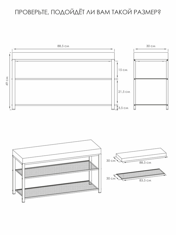 Две полки вместят до 8 пар обуви, а продуманные расстояния между ними позволят разместить как летнюю, так и зимнюю обувь.