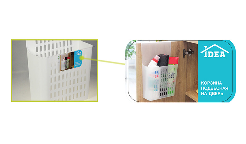 Корзина навешивается изнутри на дверцу шкафа, выдвижной ящик, рейлинг, существенно экономит пространство. Удобно для хранения средств бытовой химии. Вместительная, прочная. Материал пищевой полипропилен.