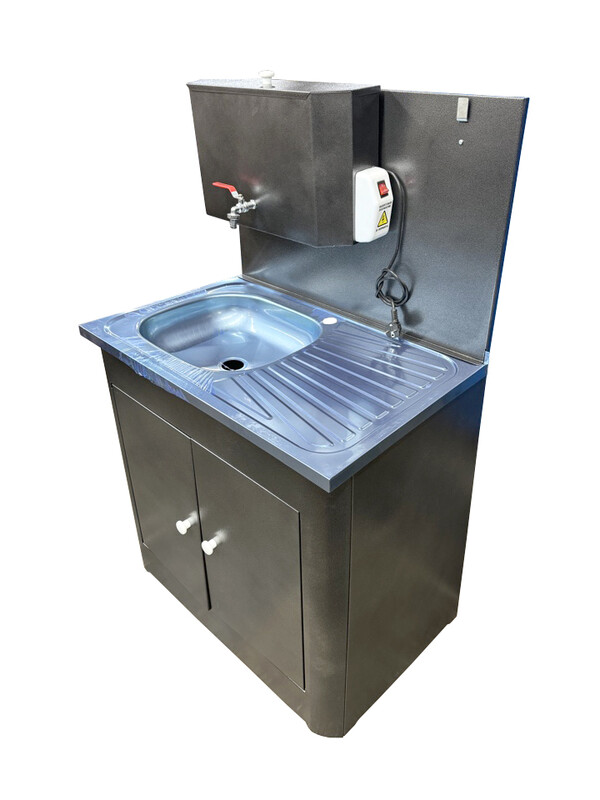 Умывальник 2-х дверный с ЭВН тумбовый предназначен не только для дачного использования, но также это прекрасное решение для автосервиса, СТО, для личного гаража или в гараж с производством или ремонтом авто, мини точек общественного питания ( шашлычные, шаурма, хот-доги и прочее ), а также для всех остальных помещений, где требуется организация мокрой зоны. При наливе воды не прогибается, крепления прочные, простая конструкция и монтаж, крышка прилегает плотно, вмещает 17 литров. Подогрев отключается автоматически. Несливаемый остаток 3 литра (остаток воды, который расположен ниже уровня крана). Вместительный бак и тумба из металла изготовлены из стали 0,7 мм толщиной, мойка 50х80 из нержавейки. Удобно доливать и следить за уровнем воды.
