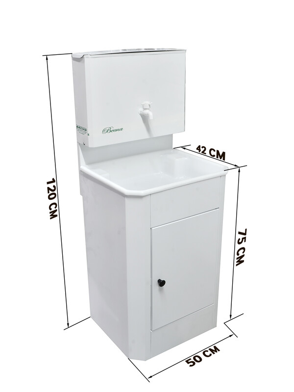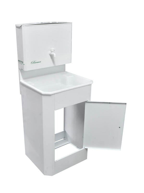 Умывальник предназначен для использования в помещениях, где отсутствует центральное водоснабжение. Мойка умывальника изготовлена из пластика и установлена на металлическую тумбу.