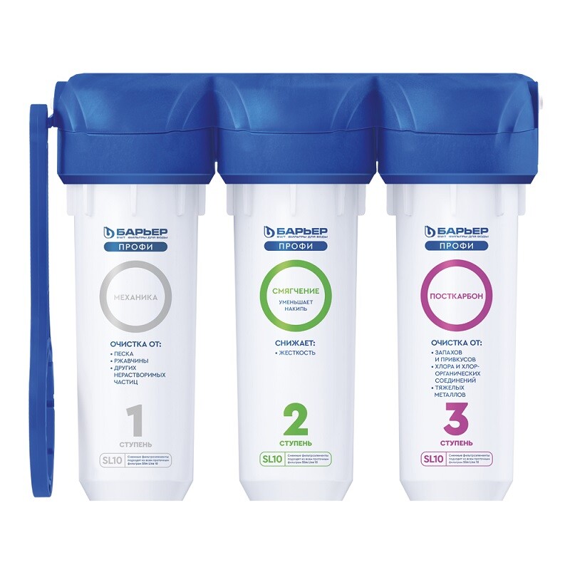 В комплекте: кран, картридж Профи Механика 5 мкм, картридж Профи Смягчение, картридж Профи ПостКарбон