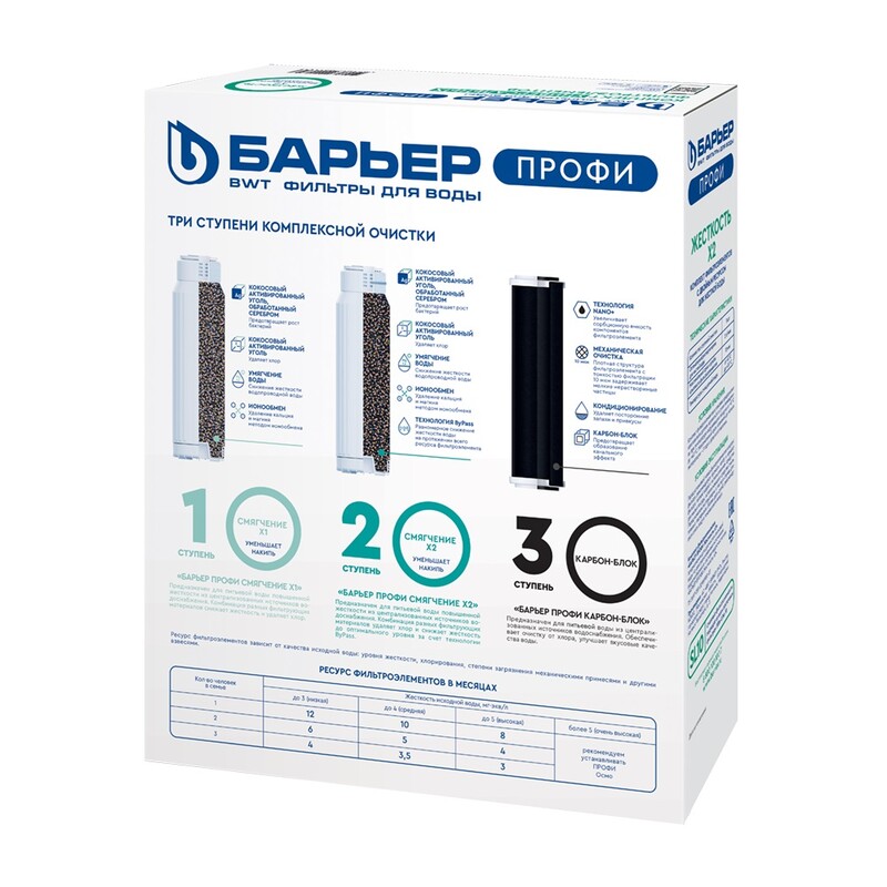 1. "БАРЬЕР ПРОФИ Смягчение х1" предварительная очистка и первый этап умягчения. Комбинация фильтрующих материалов снижает жесткость, удаляет хлор и его соединения. 2. "БАРЬЕР ПРОФИ Смягчение х2" второй этап умягчения и легкое кондиционирование. Фильтрующая смесь эффективно понижает жесткость воды. 3. "БАРЬЕР ПРОФИ Карбон-Блок" - финишная очистка и кондиционирование, устранение неприятных привкусов. Спрессованный активированный уголь в составе картриджа также удаляет хлор и его соединения.