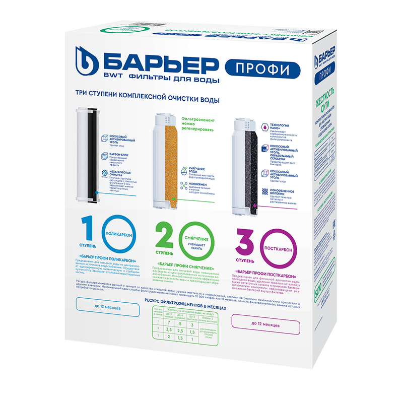 Картриджи стандарта SL 10 для жесткой и сильно хлорированной воды. Позволяют забыть о накипи. Обеспечивают более глубокую, многоступенчатую очистку от хлора и побочных продуктов хлорирования за счёт нового улучшенного состава картриджей. В комплект входит: 1."БАРЬЕР ПРОФИ Поликарбон" - сочетает в себе функцию механической и сорбционной очистки. Удаляет хлор и органические соединения. Ресурс до 10 000 литров. 2."БАРЬЕР ПРОФИ Смягчение" - снижение карбонатной жесткости, из-за которой образуется накипь в чайнике. Ресурс по умягчению воды до полугода. Картридж может быть подвергнут регенерации в домашних условиях с помощью простой поваренной НЕ йодированной соли не чаще 8 раз. 3."БАРЬЕР ПРОФИ Посткарбон" удаляет остаточный хлор и его побочные продукты, неприятные запахи и привкусы, кондиционирует воду. Ресурс 10 000 литров.