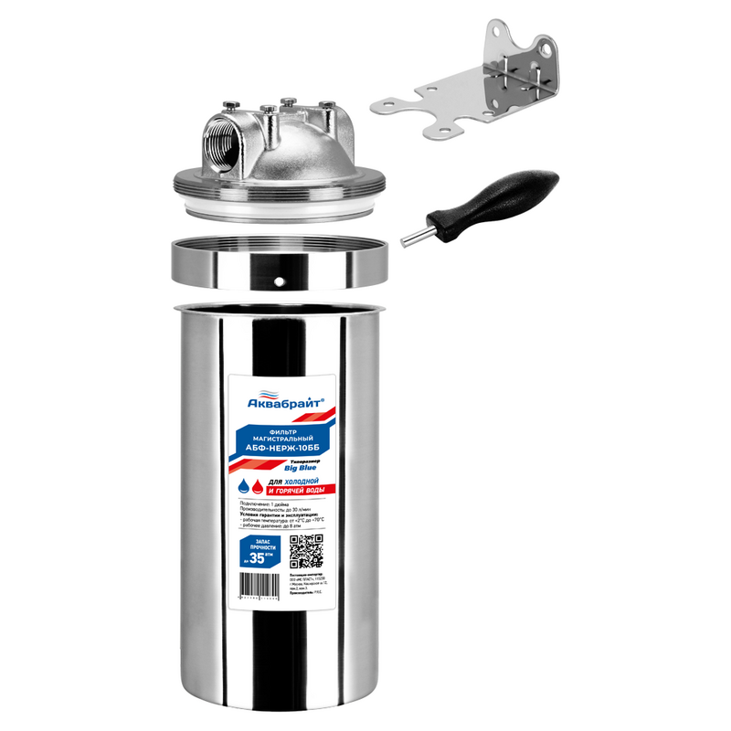 Магистральный фильтр АКВАБРАЙТ модель АБФ-НЕРЖ-10 ББ изготовлен из нержавеющей стали. Назначение: фильтр устанавливается в водопроводную магистраль и предназначен для очистки холодной и горячей воды. Эффективно задерживает различные примеси в зависимости от установленного картриджа. Рекомендуется для предварительной очистки воды.