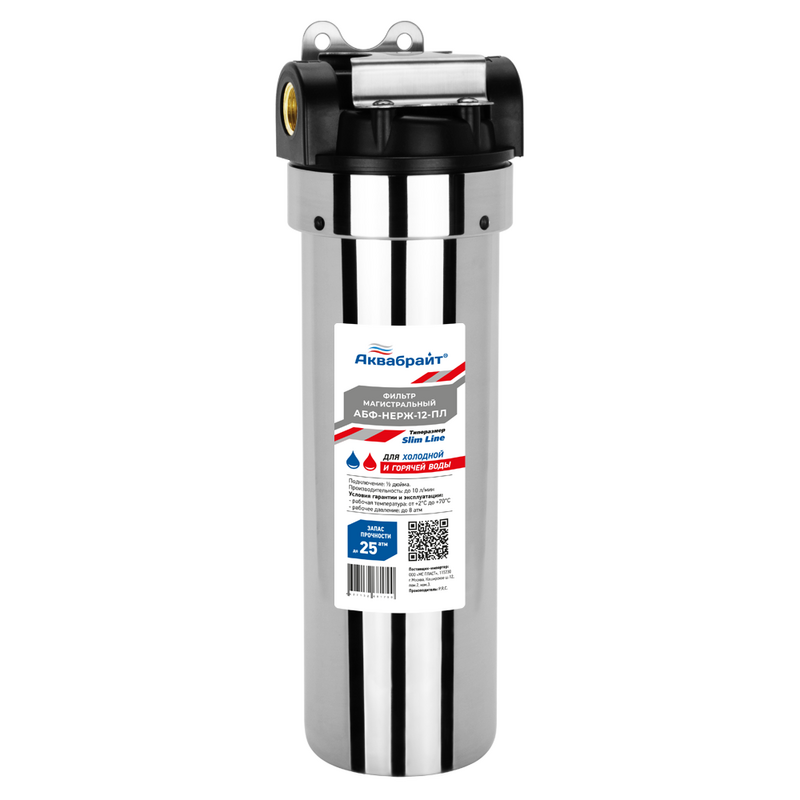 Фильтр магистральный Аквабрайт Slim Line 10 для горячей воды вход 1/2 Нержавейка (без картриджа) АБФ-НЕРЖ-12