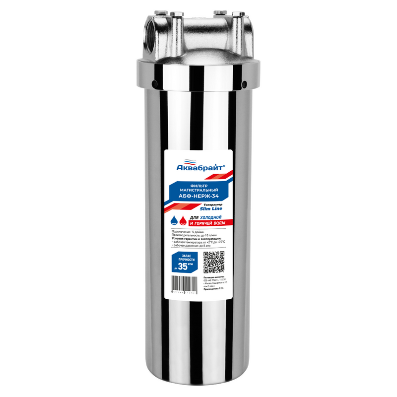 Фильтр магистральный Аквабрайт Slim Line 10 для горячей воды вход 3/4 Нержавейка (без картриджа) АБФ-НЕРЖ-34